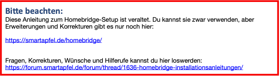 • Darüber könnte man wirklich nachdenken, aber die alte Anleitung müsste so umgeschrieben werden, dass sie eine Homebridge erzeugt, die der neuen Anleitung gleichkommt.