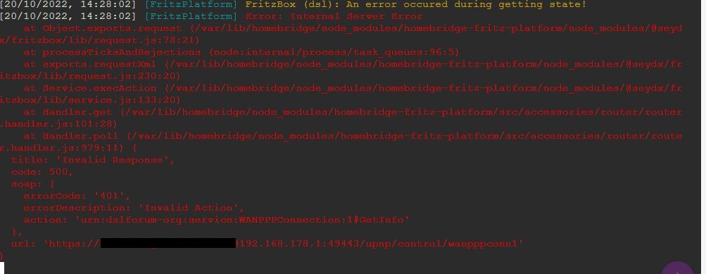 Alles anzeigen[21/10/2022, 06:05:45] [FritzPlatform] FritzBox (dsl): An error occured during getting state! [21/10/2022, 06:05:45] [FritzPlatform] Error: Unauthorized at Object.exports.request (/var/lib/homebridge/node_modules/homebridge-fritz-platform/node_modules/@seydx/fritzbox/lib/request.js:78:21) at runMicrotasks (<anonymous>) at processTicksAndRejections (node:internal/process/task_queues:96:5) at exports.requestXml (/var/lib/homebridge/node_modules/homebridge-fritz-platform/node_modules/@seydx/fritzbox/lib/request.js:230:20) at Service.execAction (/var/lib/homebridge/node_modules/homebridge-fritz-platform/node_modules/@seydx/fritzbox/lib/service.js:133:20) at Handler.get (/var/lib/homebridge/node_modules/homebridge-fritz-platform/src/accessories/router/router.handler.js:101:28) at Handler.poll (/var/lib/homebridge/node_modules/homebridge-fritz-platform/src/accessories/router/router.handler.js:979:11) { title: 'Invalid Response', code: 401, soap: {}, url: 'https://false:[email protected]:49443/upnp/control/wanpppconn1' }