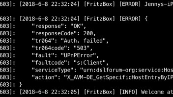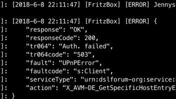 Alles anzeigenJun 08 22:04:21 raspberrypi-3BPlus homebridge[1338]: [2018-6-8 22:04:21] [FritzBox] [INFO] Platform initialization finished Jun 08 22:04:21 raspberrypi-3BPlus homebridge[1338]: [2018-6-8 22:04:21] [FritzBox] [ERROR] David iPhone: An error occured by getting presence state, trying again... Jun 08 22:04:21 raspberrypi-3BPlus homebridge[1338]: [2018-6-8 22:04:21] [FritzBox] [ERROR] { Jun 08 22:04:21 raspberrypi-3BPlus homebridge[1338]: "response": "OK", Jun 08 22:04:21 raspberrypi-3BPlus homebridge[1338]: "responseCode": 200, Jun 08 22:04:21 raspberrypi-3BPlus homebridge[1338]: "tr064": "Auth. failed", Jun 08 22:04:21 raspberrypi-3BPlus homebridge[1338]: "tr064code": "503", Jun 08 22:04:21 raspberrypi-3BPlus homebridge[1338]: "fault": "UPnPError", Jun 08 22:04:21 raspberrypi-3BPlus homebridge[1338]: "faultcode": "s:Client", Jun 08 22:04:21 raspberrypi-3BPlus homebridge[1338]: "serviceType": "urn:dslforum-org:service:Hosts:1", Jun 08 22:04:21 raspberrypi-3BPlus homebridge[1338]: "action": "X_AVM-DE_GetSpecificHostEntryExt" Jun 08 22:04:21 raspberrypi-3BPlus homebridge[1338]: } Jun 08 22:04:21 raspberrypi-3BPlus homebridge[1338]: [2018-6-8 22:04:21] [FritzBox] [ERROR] Daniel iPhone: An error occured by getting presence state, trying again... Jun 08 22:04:21 raspberrypi-3BPlus homebridge[1338]: [2018-6-8 22:04:21] [FritzBox] [ERROR] { Jun 08 22:04:21 raspberrypi-3BPlus homebridge[1338]: "response": "OK", Jun 08 22:04:21 raspberrypi-3BPlus homebridge[1338]: "responseCode": 200, Jun 08 22:04:21 raspberrypi-3BPlus homebridge[1338]: "tr064": "Auth. failed", Jun 08 22:04:21 raspberrypi-3BPlus homebridge[1338]: "tr064code": "503", Jun 08 22:04:21 raspberrypi-3BPlus homebridge[1338]: "fault": "UPnPError", Jun 08 22:04:21 raspberrypi-3BPlus homebridge[1338]: "faultcode": "s:Client", Jun 08 22:04:21 raspberrypi-3BPlus homebridge[1338]: "serviceType": "urn:dslforum-org:service:Hosts:1", Jun 08 22:04:21 raspberrypi-3BPlus homebridge[1338]: "action": "X_AVM-DE_GetSpecificHostEntryExt" Jun 08 22:04:21 raspberrypi-3BPlus homebridge[1338]: } Jun 08 22:04:21 raspberrypi-3BPlus homebridge[1338]: [2018-6-8 22:04:21] [FritzBox] [ERROR] David MacBook: An error occured by getting presence state, trying again... Jun 08 22:04:21 raspberrypi-3BPlus homebridge[1338]: [2018-6-8 22:04:21] [FritzBox] [ERROR] { Jun 08 22:04:21 raspberrypi-3BPlus homebridge[1338]: "response": "OK", Jun 08 22:04:21 raspberrypi-3BPlus homebridge[1338]: "responseCode": 200, Jun 08 22:04:21 raspberrypi-3BPlus homebridge[1338]: "tr064": "Auth. failed", Jun 08 22:04:21 raspberrypi-3BPlus homebridge[1338]: "tr064code": "503", Jun 08 22:04:21 raspberrypi-3BPlus homebridge[1338]: "fault": "UPnPError", Jun 08 22:04:21 raspberrypi-3BPlus homebridge[1338]: "faultcode": "s:Client", Jun 08 22:04:21 raspberrypi-3BPlus homebridge[1338]: "serviceType": "urn:dslforum-org:service:Hosts:1", Jun 08 22:04:21 raspberrypi-3BPlus homebridge[1338]: "action": "X_AVM-DE_GetSpecificHostEntryExt"2.3.4 ist online, sollte es fixen