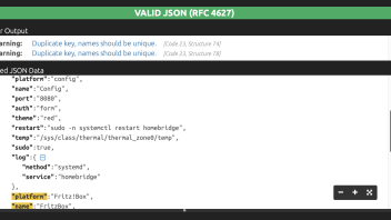 Ich hab die Config auch nochmal in den JSON Formatter / Validator eingegeben. Und bekomme einen Warnhinweis.