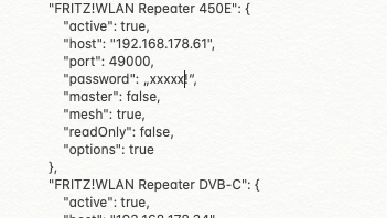 Nur wird die config.json überhaupt nicht weiter angepasst, da kann ich neustarten und testen so oft ich will... dass ich die Boxen überhaupt manuell auf active=true setzen muss kann doch schon mal nicht richtig sein und augenscheinlich klappt die komplette Geräteerkennung nicht statt... an den Zugangsdaten kann es nicht liegen, das plugin loggt sich ein und ich bekomme beide Boxen in als Schalter HK angezeigt, aber eben nur mit der WAN IP beim Master, sonst steht da nichts. Ich hatte es zuerst mit einem eigenen Benutzer dafür versucht, jetzt mal den admin genommen um zu schauen ob es damit klappt aber das Ergebnis ist jeweils das gleiche... habe das nun diverse male erfoglos versucht und bin am verzweifeln... das ist die vom plugin eingetragene und von mir gem. Vorgabe angepasste config: