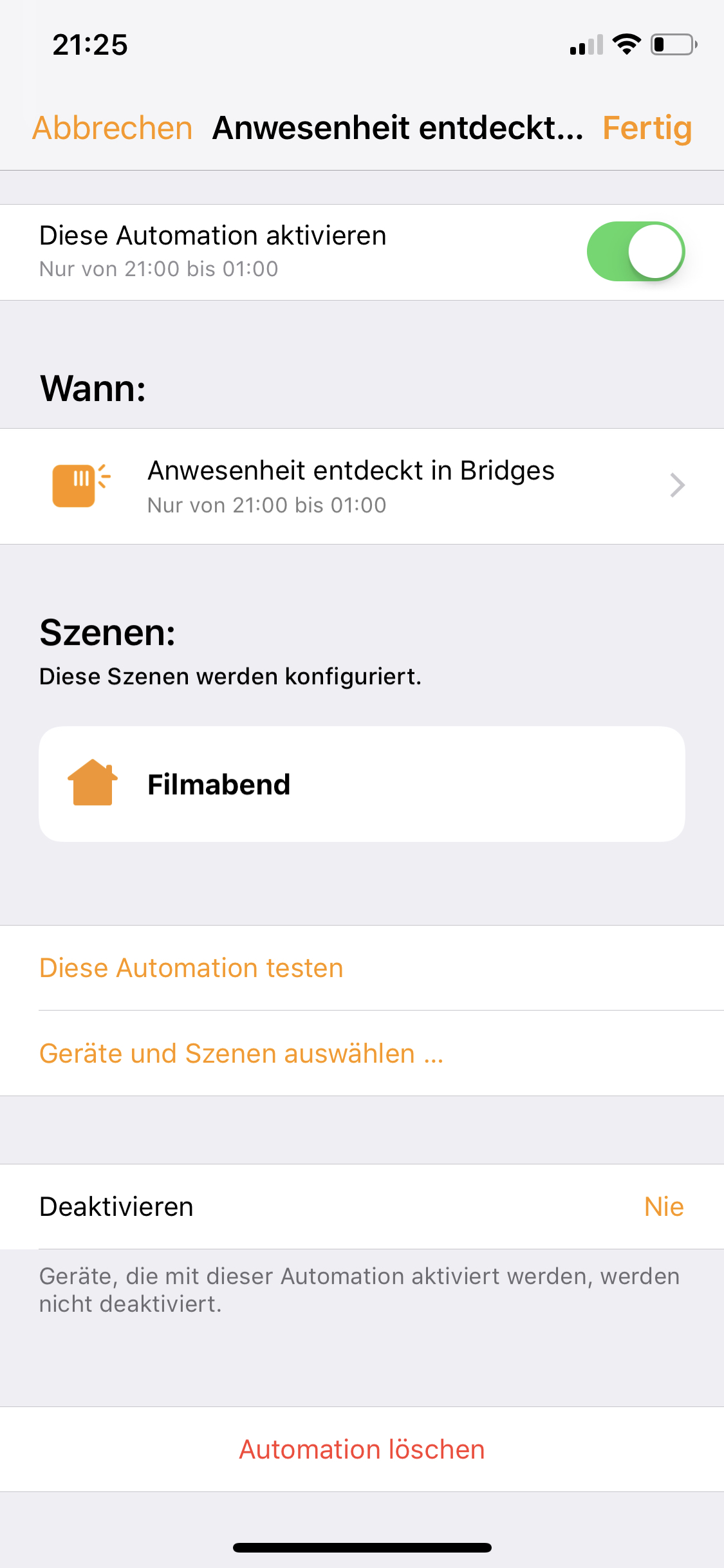 Heute saß ich schon vor 21Uhr am Fernseher und die Automation hat sich ab 21Uhr nicht aktiviert. Ich vermute, weil der Sensor schon vorher getriggered wurde und deshalb die Automation nicht ausgeloest hat.