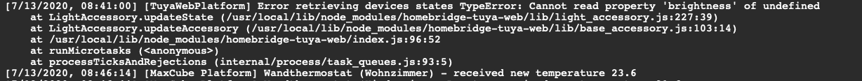ich habe das aktuelle Update für Homebridge_Tuya_web geladen und jetzt folgendes Problem auf der Homebridge, wie auf dem Bild zu sehen ist. Ich kann in der Tuya Smart App alles ganz normal benutzen.