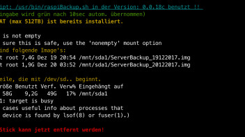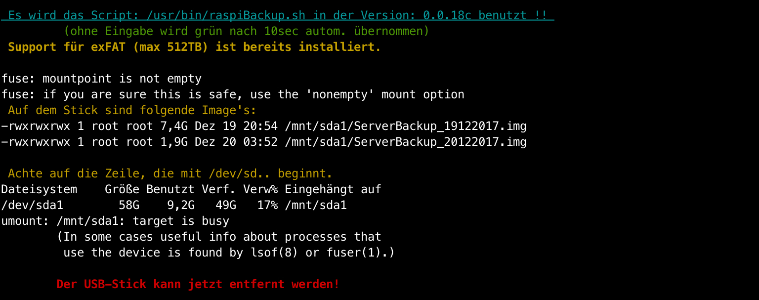 Wenn ich den Stick mit umount entferne verschwindet die Warnung beim nächsten aufrufen mit RaspiBackup.sh list.