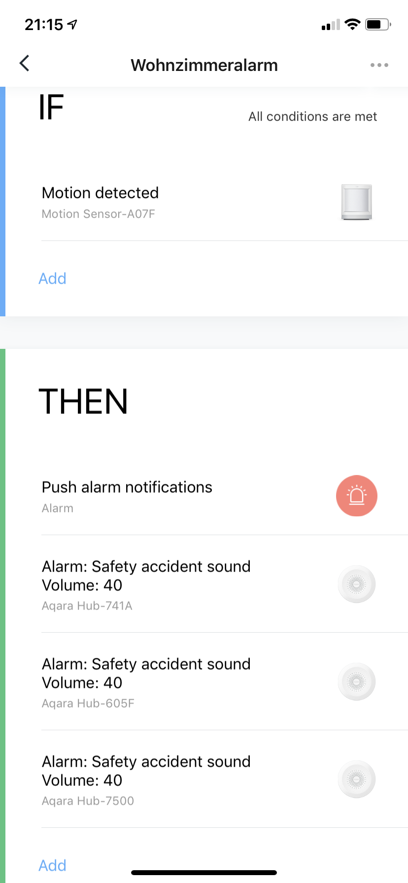 In Aqara sieht das so aus (bei mir schlagen dann alle drei Hubs Alarm):