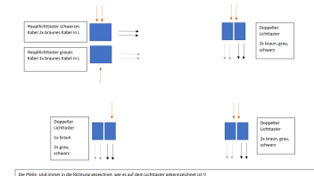 Ich habe einmal alle Lichttaster (4 Stück) ausgebaut und mir die Belegung angesehen. Ich habe das ganze einmal etwas aufgezeichnet, mit der Hoffnung, dass jemand etwas damit anfangen kann.
