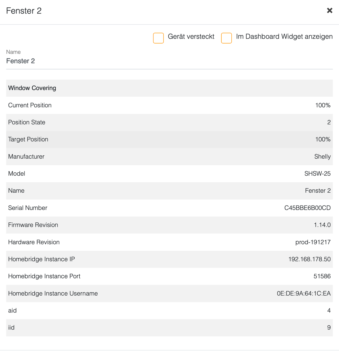 - Starte ich Homebridge neu, läuft alles, wie es soll. Die Shelly-Devices werden erkannt, ich kann sie steuern, also ein- und ausschalten, bzw. dimmen oder auch bei Shelly 2.5 die Jalousie-Position über HomeKit steuern