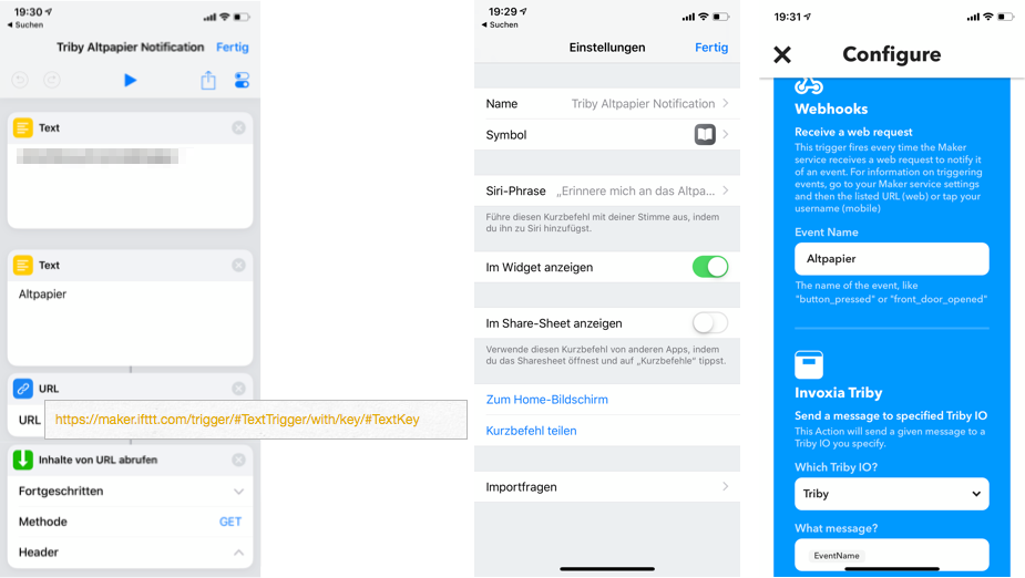 Einfach IFTTT Webhook angelegt und in den Siri Kurzbefehlen einen kleinen Ablauf erstellt.