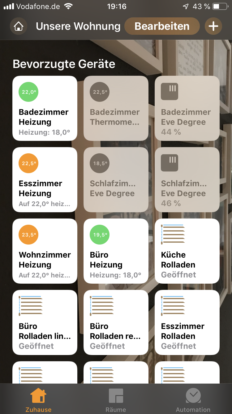 Ich habe im Bad und Wohnzimmer je eine Eve Thermo installiert. Soweit funktioniert auch alles. Abgesehen davon, dass die Raumtemperatur erheblich von der Temperatur am Thermo abweicht. Dies habe ich mir aber „hingedaddelt“. Nun zeigt mein Raumthermometer im Bad 21 Grad Celsius während der Eve Thermo 27 Grad anzeigt. Kann ich mit leben. Was ich nicht verstehe, ist die Tatsache das in der Home App nur sehr selten „Grün“ angezeigt wird. Stets „wird geheizt“. Auch wenn das Ventil zu ist und die Raumtemperatur von 21 auf 18,5 Grad abgesenkt wird, steht „wird geheizt“ in der App. Warum? Müßte nicht auch beim absenken „Grün“ angezeigt werden?