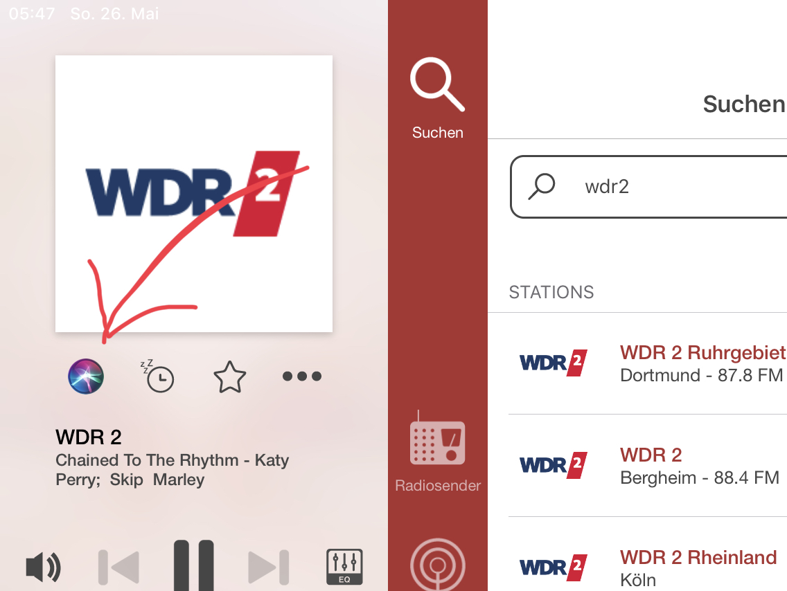 In mytuner wdr2 suchen und starten, dann wie im Bild markiert auf den Siri Button klicken und „spiele WDR2“ als Befehl aufzeichnen. Kurz warten bis sich Siri synchronisiert hat. Dann kann ich die App aus dem Speicher schmeißen und trotzdem mytuner und den Sender sogar bei gesperrtem Bildschirm starten.