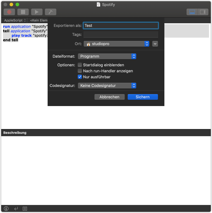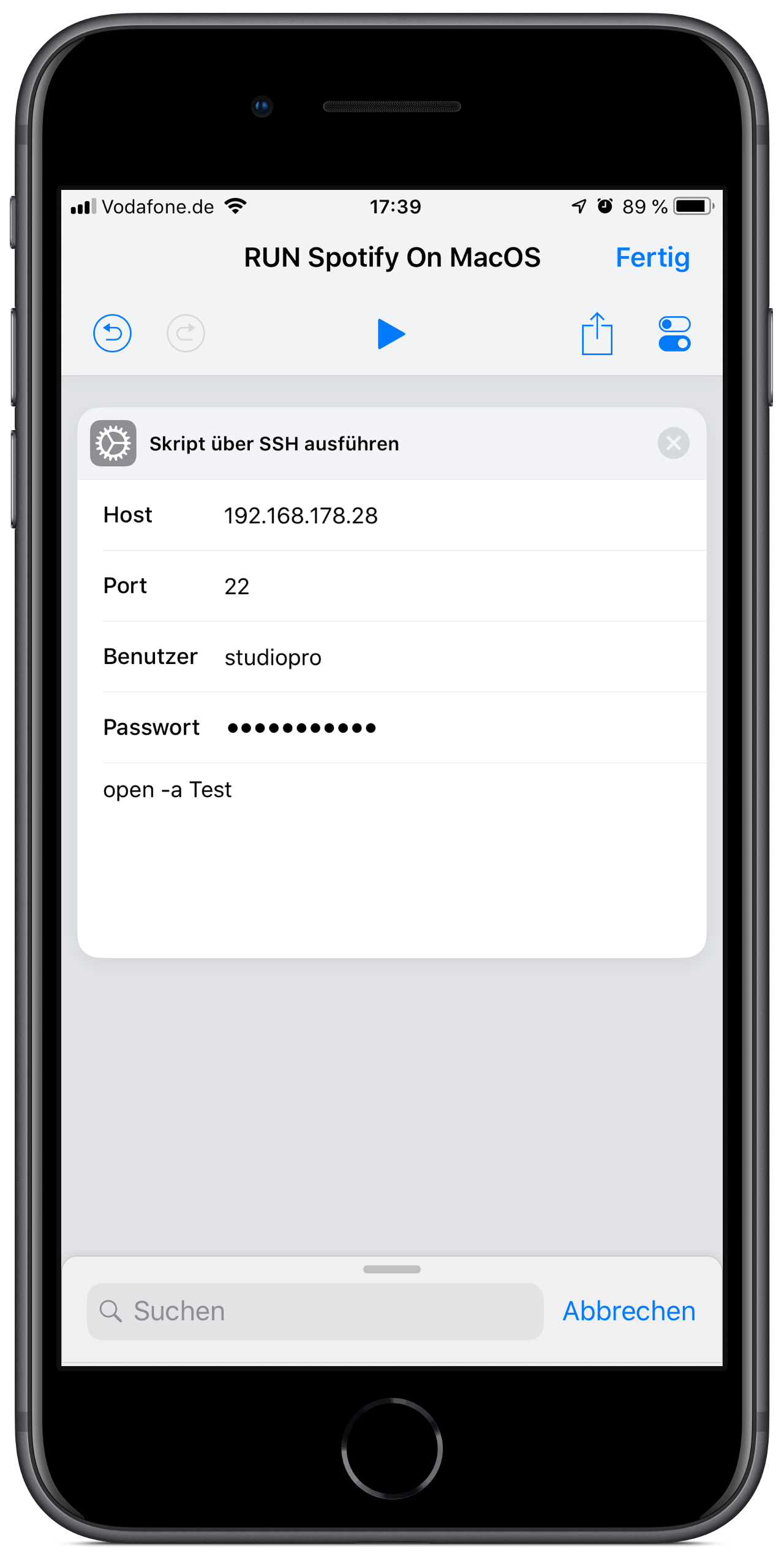 Ich wollte gerne das ich via Shortcuts auf meinem Mac im Netzwerk zugreife (SSH )und Spotify zum spielen meiner Playlist bringe (AppleScript).