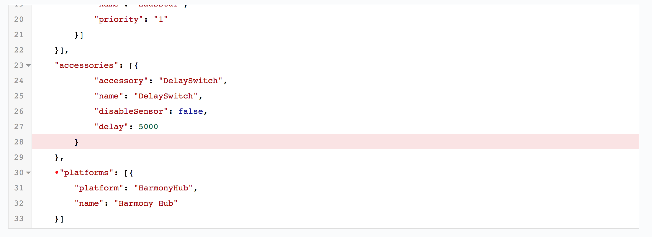 Nochmal: "accessories":-Definitionen beginnen mit einer eckigen Klammer und hören mit einer auf. Das passiert bei dir aber nicht. Es kommt irgendeine Plattform anstatt eines Accessories. Das Harmony Hub-Zeugs hat an dieser Stelle nicht verloren! Es muss weiter nach oben zu den anderen platforms. Und in Zeile 29 muss dann eine ] hin. Und ganz ans Ende, wenn nichts weiter mehr kommt, muss die Konfiguration mit } abgeschlossen werden - weil sie beginnt ja ganz oben mit {.