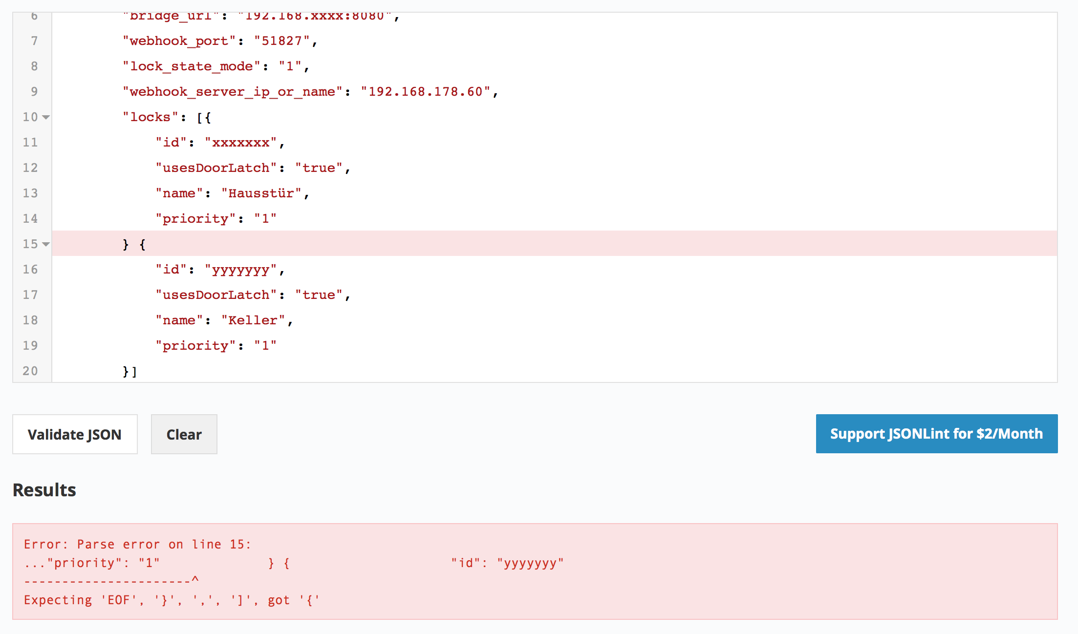 Das gibt dem ganze eine Struktur und man versteht schneller, was wohin gehört. Ich hab da jetzt einen Fehler eingebaut, und der erzeugt bei jsonlint die folgende Ausgabe: