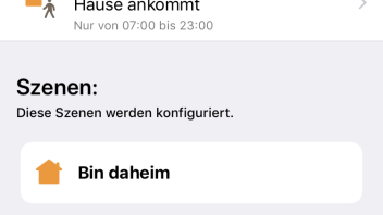 • Meine Automation funktioniert auch noch nicht. Könnte aber auch ein Anfänger-Fehler sein. Habe eine Automation erstellt, dass die Heizung angeht wenn ich tagsüber nach Hause komme. "Tagsüber" definiert HomeKit mit dem Zeitraum zwischen Sonnenaufgang und Sonnenuntergang. Wahrscheinlich komme ich einfach zu spät heim. Habe das mal geändert und teste (und berichte) weiter. ?(
