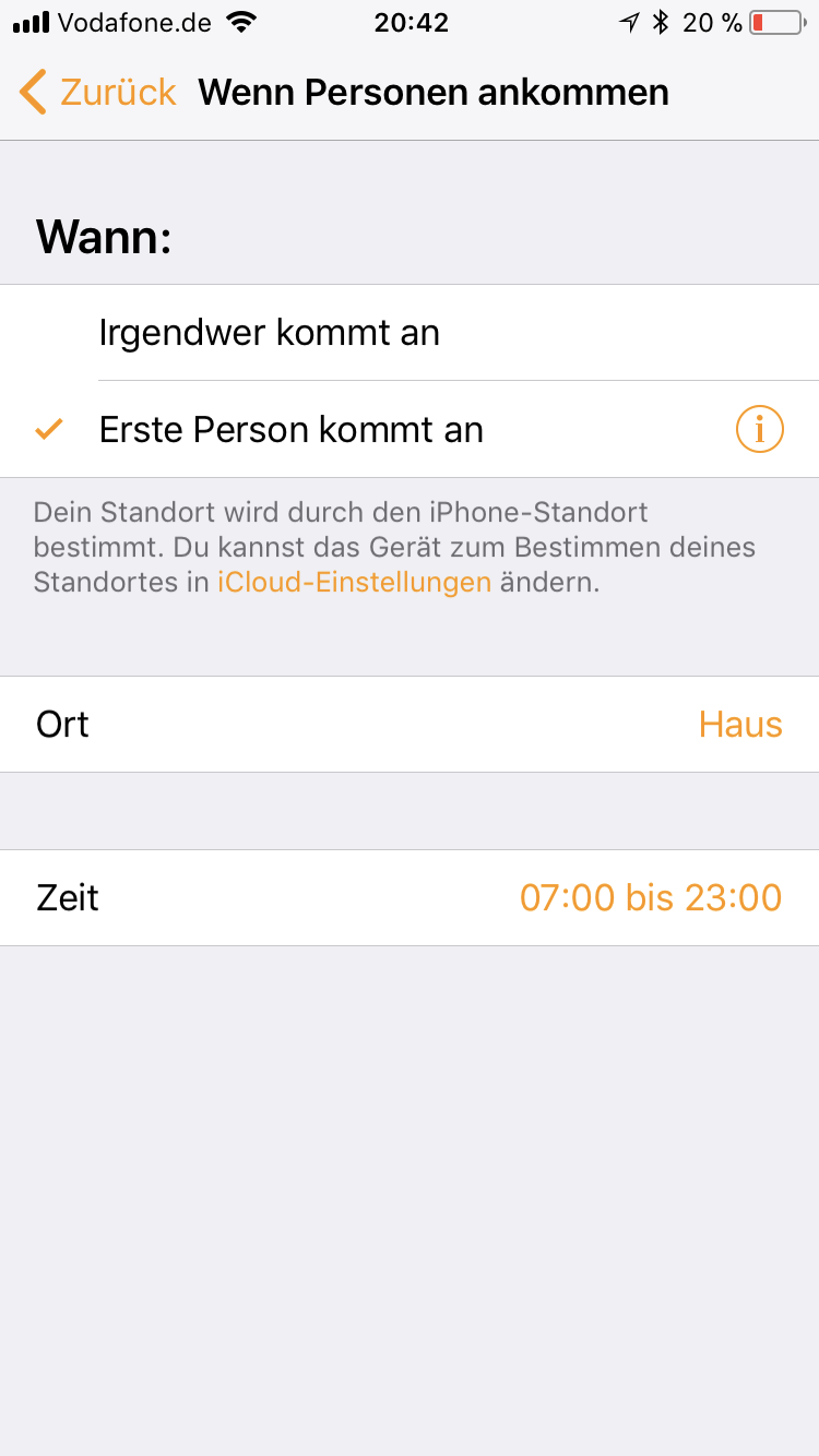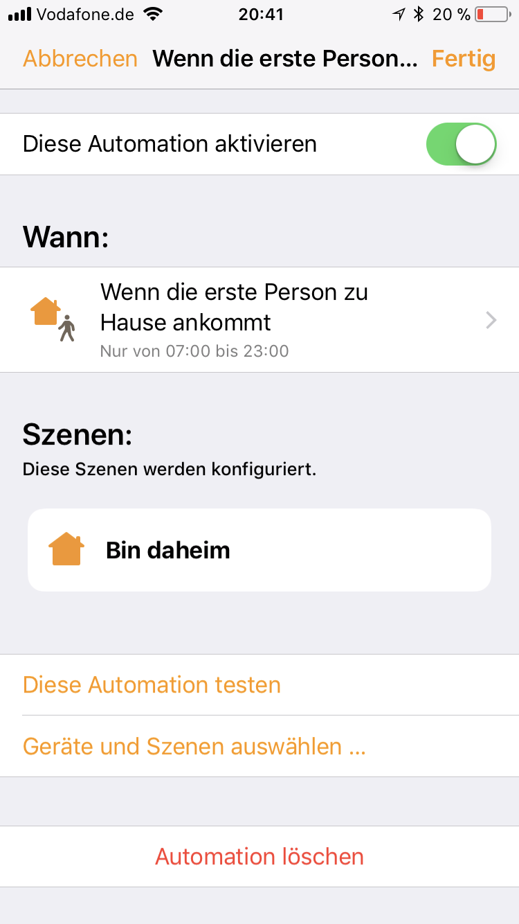 Meine Automation funktioniert auch noch nicht. Könnte aber auch ein Anfänger-Fehler sein. Habe eine Automation erstellt, dass die Heizung angeht wenn ich tagsüber nach Hause komme. "Tagsüber" definiert HomeKit mit dem Zeitraum zwischen Sonnenaufgang und Sonnenuntergang. Wahrscheinlich komme ich einfach zu spät heim. Habe das mal geändert und teste (und berichte) weiter. ![]()