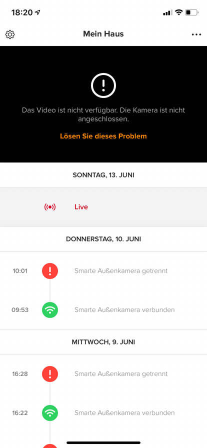 Ich hab mir im Zuge des Amazon Prime Days die Netatmo Presence Aussenkamera angeschafft und tagsüber funktioniert sie wirklich einwandfrei ABER sobald die Kamera in den Nachtmodus wechselt verliere ich die Verbindung zur Kamera bzw. scheint es als hätte ich nur 1x kurz pro Minute eine Verbindung zur Kamera. Zusätzlich zeigt die App, dass die Kamera jede Minute gestartet wird (Siehe auch Screenshot anbei)