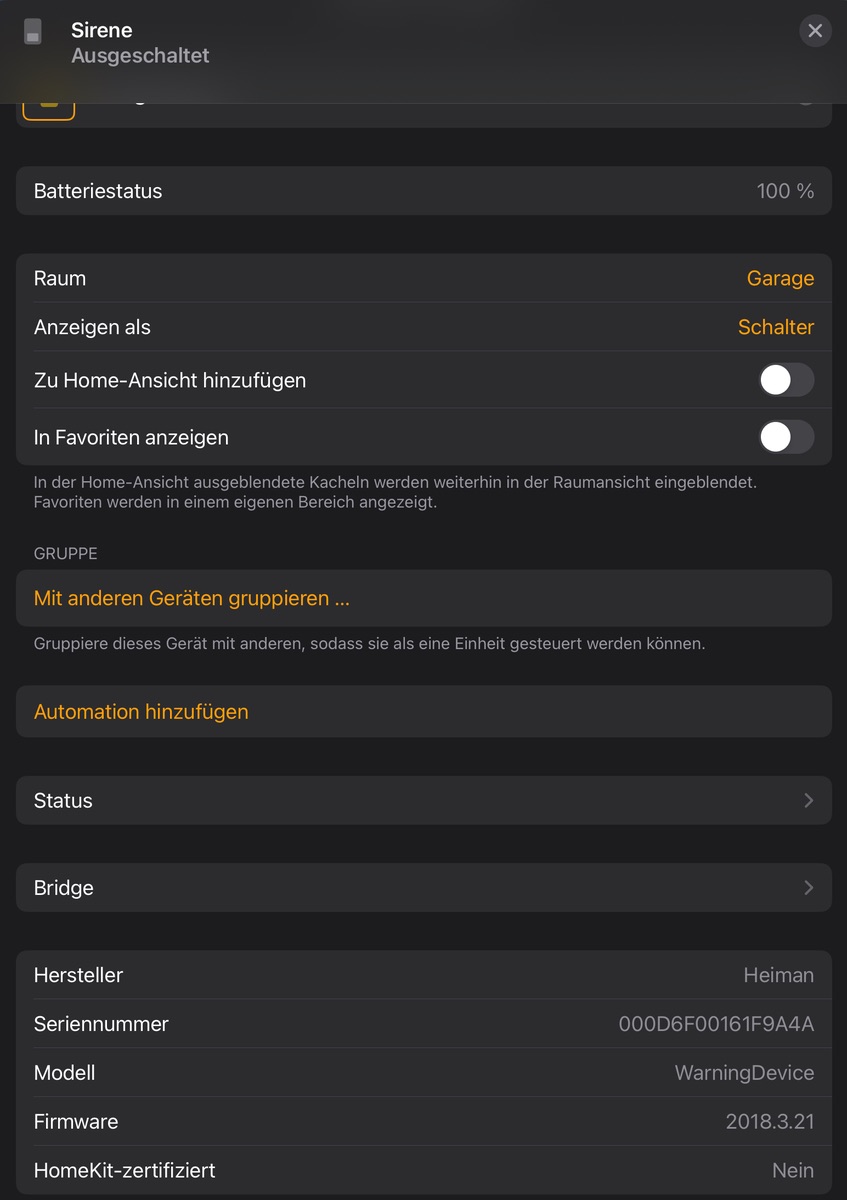 Das Einbinden über Phsocon/Conbee und homebridge war einfach und hat sofort funktioniert. Der Test lief gut oder schlecht ab - meine allerbeste Freundin hat furchbar geschimpft als das Ding losging - war aber in dem Augenblick egal, man hört neben dem Ding gar nichts mehr ![]()