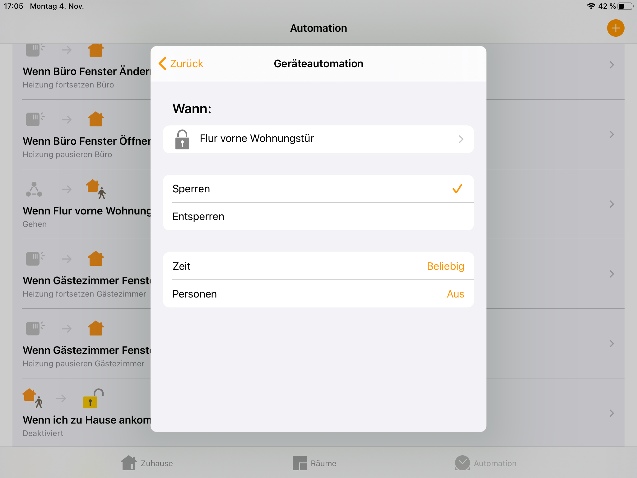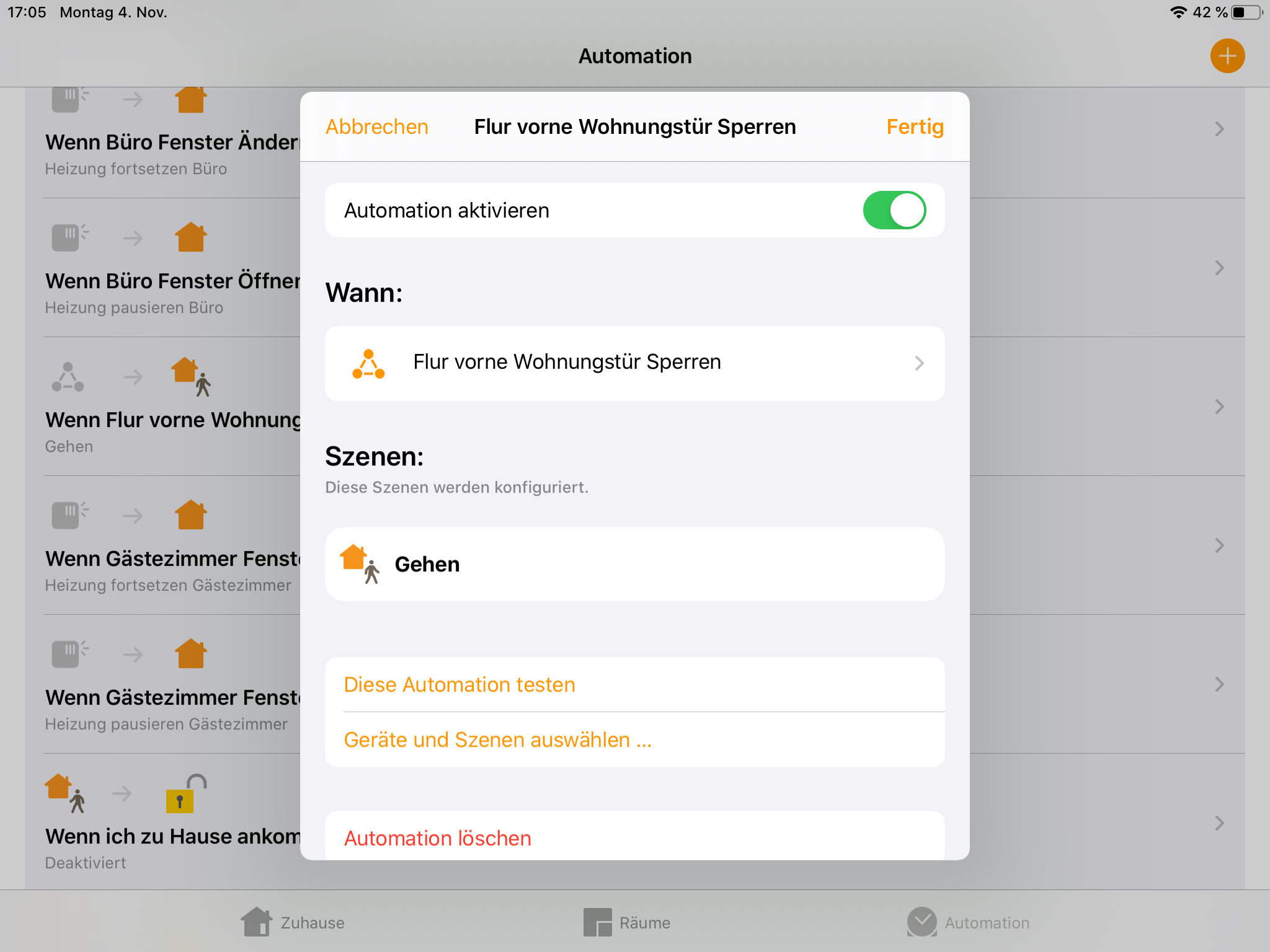 Ich habe Nuki ohne Hombebridge in HomeKit eingebunden. Ich habe eine Automation erstellt: „wenn letzte Person Haus verlässt dann Tür abschließen“. Die letzte Person bekommt beim Entfernen vom Haus aber immer eine Mitteilung „soll die Szene ausgeführt werden“. Ohne ein Bestätigungsklick passiert nichts. Ist das so gewollt? Sehr blöd.