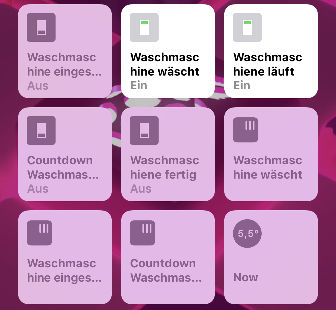Je nach Waschmaschine und wie diese sich verhält wenn sie fertig ist kann es sinnvoll sein per Homebridge weitere Zustandschalter und Countdowns hinzufügen. Meine Waschmaschine schaltet nicht einfach den Strom aus wenn sie fertig ist, sondern dreht sich alle paar Minuten weiter, bis man sie deaktiviert, das heißt dann Knitterschutz.