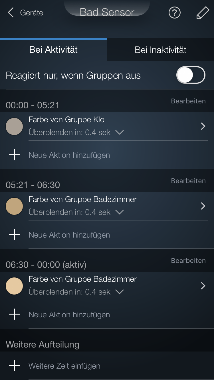 Nun allerdings hat sich ein für mich unerklärlicher Fehler eingeschlichen. Wenn ich die App geöffnet habe, wird mir korrekt angezeigt in welcher Zeitspanne ich mich gerade befinde. Allerdings wird nicht die richtige Aktion ausgeführt. In meinem konkreten Fall wird die Lichteinstellung einer späteren Zeitspanne aktiviert. Wenn ich also um 19.00 Uhr in die Küche gehe, geht das Nachtlicht in der Küche an, obwohl das erst nach 23.00 Uhr passieren dürfte.
