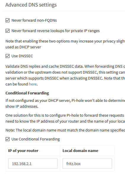 Ich habe hie pi-hole auf einem Pi zero WH an einer Fritz!Box laufen. Ich habe es so eingestellt, das die Fritz DNS Angaben jetzt auf dem Pi eingetragen sind und trotzdem die internen Namen aus der Fritzbox wie z.B. fritz.box oder xyz.local funktionieren.