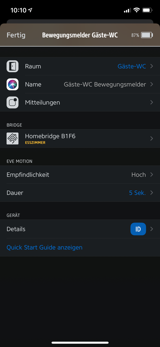 Via der Eve-App habe ich die Duration des Bewegungsmelder auf 60 Sekunden gesetzt, ich hätte zwar gerne 40 Sekunden, doch das geht mit der Eve-App nicht. Ja, ich habe mir dazu auch eine andere App heruntergeladen (Controller), bei der ich die Duration manuell eingeben kann (ich hätte gerne 40 Sekunden, Erklärung folgt gleich), dieses geht auch, doch nur bei bestimmten Werten. Trage ich via der Controller-App 40 Sekunden ein, so ändert es die HB und z.B. auch die Eve-App automatisch auf 60 Sekunden.
