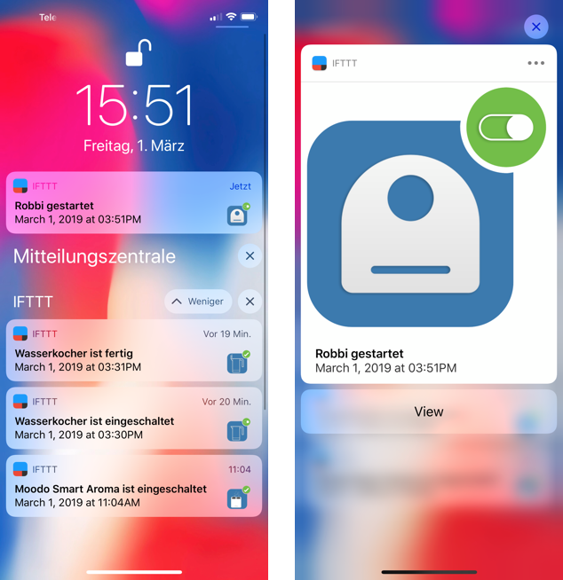 Vorteil von den IFTTT Rich Notification ist zudem auch noch, dass man auch eine Link URL hinterlegen kann. Wenn eine App den Aufruf durch URL-Scheme unterstützt, kann man beim Klick auf "View", wenn die Notification kommt, direkt in die App springen. Z.B. mihome:// oder HomeConect:// öffnen die entsprechende App.