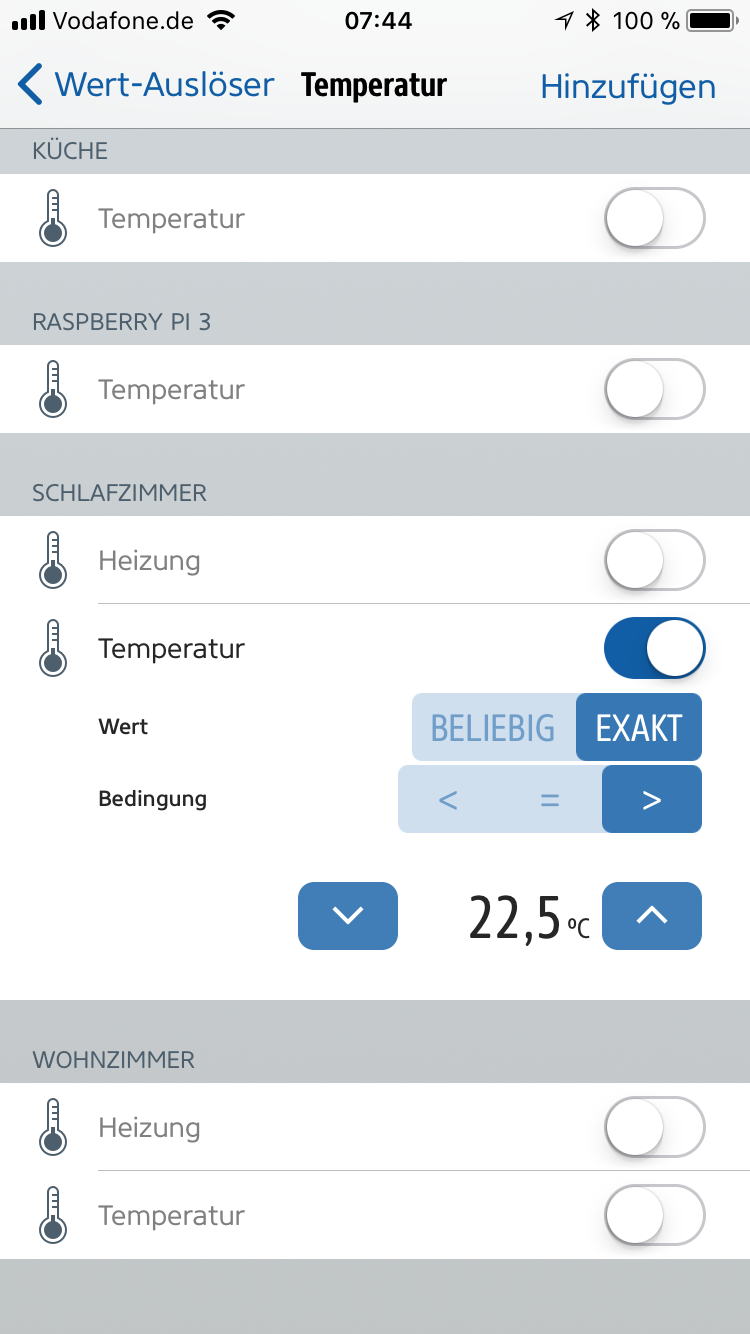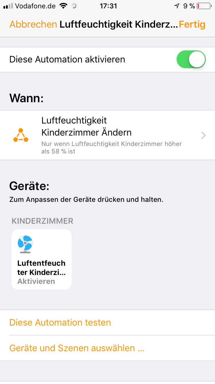 Was bisher auch nicht ging: Eine Automation, die in Eve angelegt wurde, kann man nun in Home ändern. Beispiel: Eine klimaabhängige Regel (wenn Luftfeuchtigkeit > 58%) geht in Home (auch weiterhin) nicht zu erstellen, mache ich also in Eve. In Eve kann ich aber nun mit der Regel keine Geräte schalten, sondern nur Szenen, was mich ziemlich nervt.