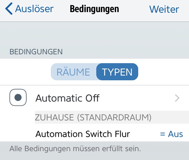 In meinem Fall geht kein Saugroboter los, sondern meine Lampe in der Küche wird eingeschalten. Was jetzt fehlt ist eine Automation (dafür reicht HomeKit) welchen den Fake Switch wieder irgendwann auf Off setzt. Sonst geht diese Automation nur ein einziges Mal, da der Wert sich ja nicht mehr ändert.