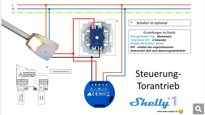 Hallo da gibt es zwei Möglichkeiten einen Shelly 1 alst Taster konfiguriert, Nachteil man weiss nicht ob das Tor aufgeht oder zu, bzw wie der aktuelle Stand des Tores ist.