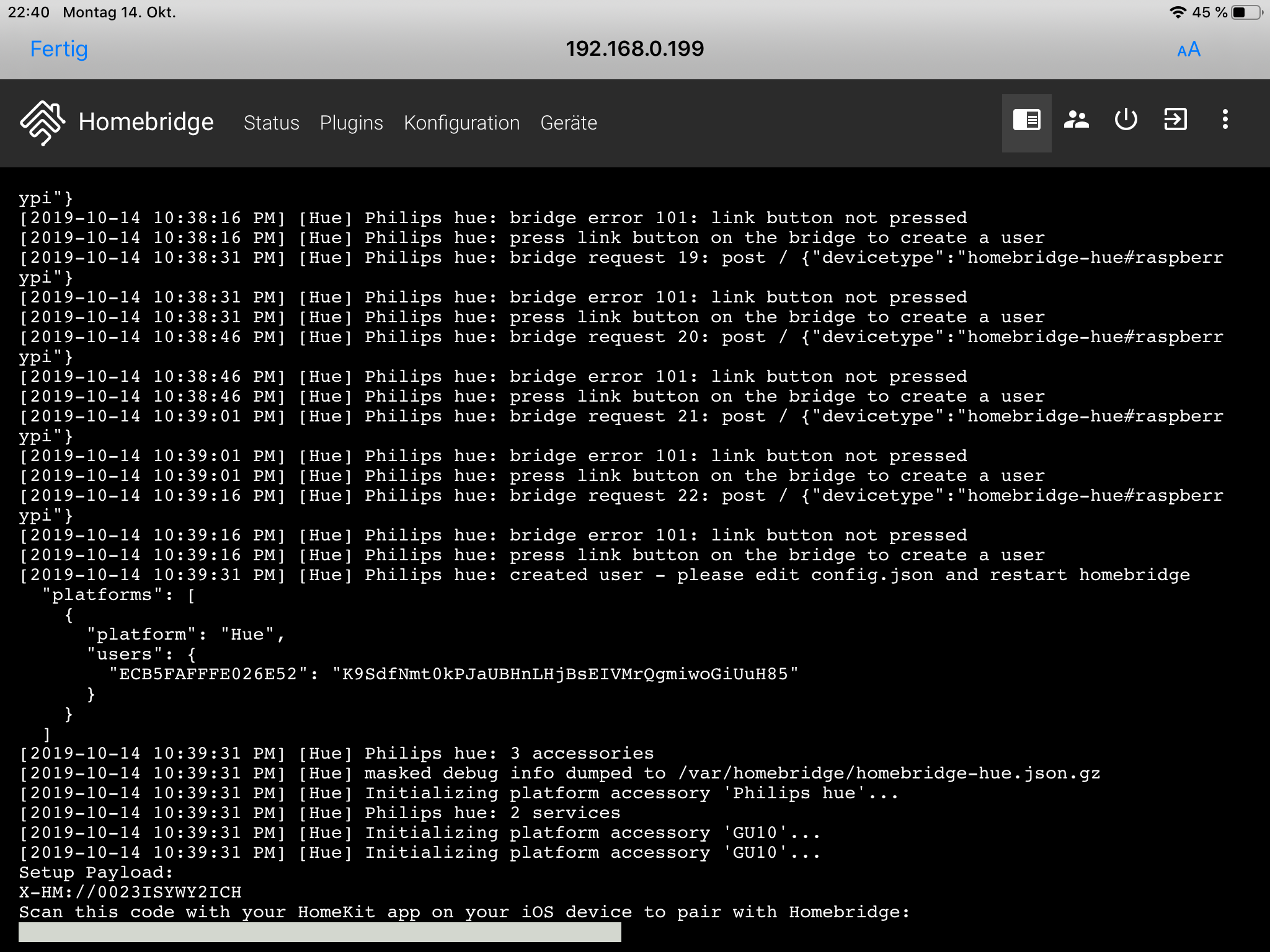 Wenn du nun die Homebridge Startest, müsste die dich auffordern auf deiner Hue Bridge den Button zu drücken, dann wird dir im Terminal wo die Homebridge läuft ein User angezeigt, nach so einen Schema "001788FFFEyyyyyy": "yyyyyyyyyyyyyyyyyyyyyyyyyyyyyyyyyyyyyyyy". Diesen User fügst du dann in deiner Config ein.