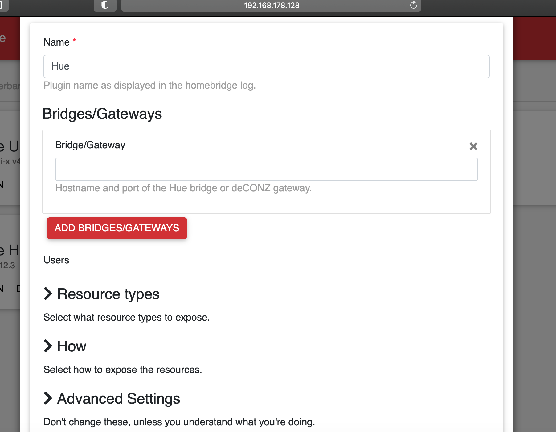 Ausgerechnet homebridge-hue ist etwas speziell am Anfang. Da das Plugin mit der Hue-Bridge kommunizieren will und die Hue-Brigde das nur zulässt, wenn man sich darauf einloggt, muss das Plugin erst einmal einen User dort anlegen.