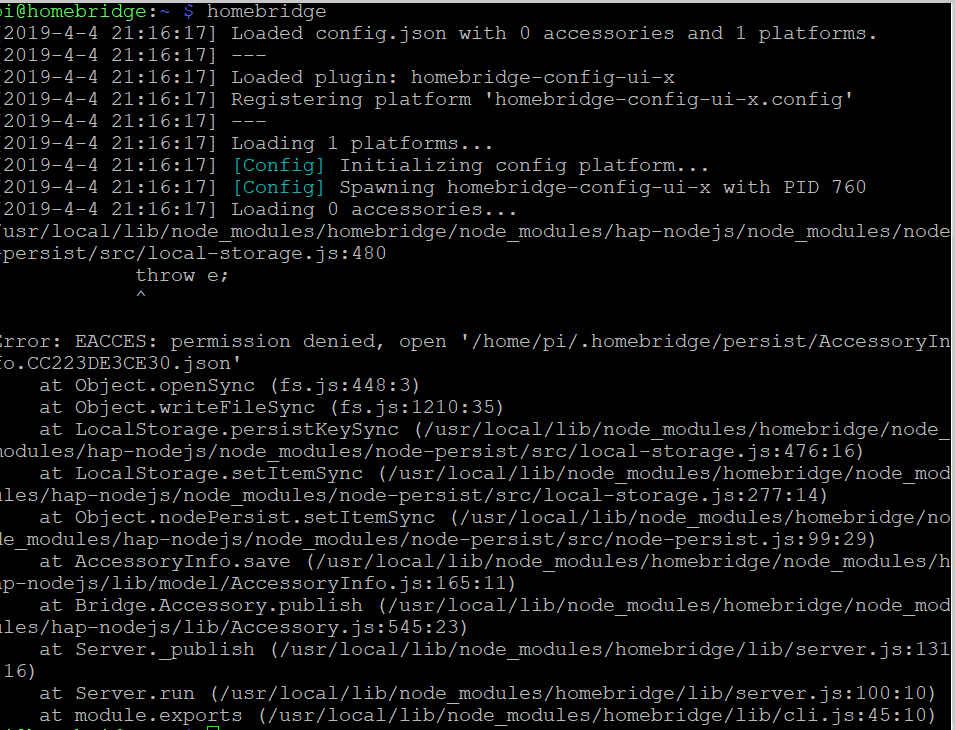 Apr 7 14:18:17 raspberrypi homebridge[11745]: [2019-4-7 14:18:17] [Config] Spawning homebridge-config-ui-x with PID 11795