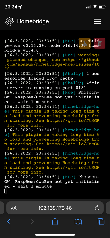 Ein Neustart hat geholfen. Homebridge läuft, Phoscon läuft, aber...