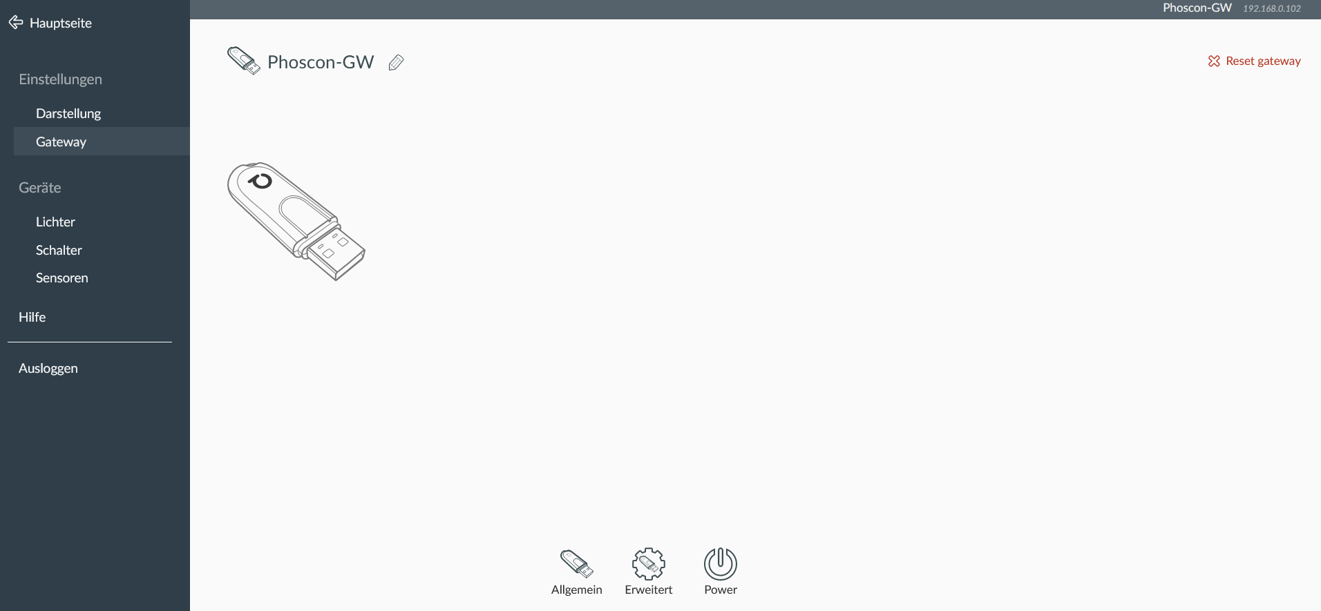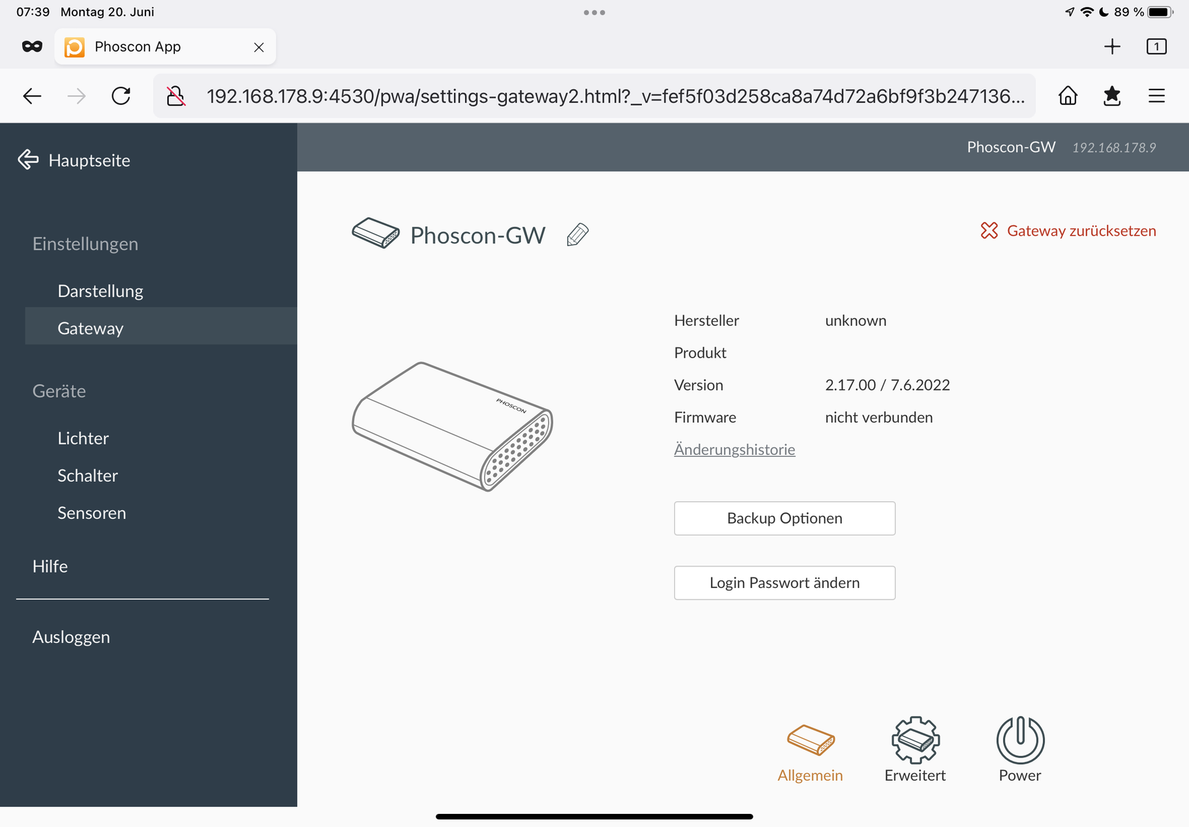 Mit diesem System kann überprüft werden ob in der Phoscon App unter Menü > Gateway > Allgemein > Firmware eine Version im Format 26xx0700 steht - und nicht "Firmware nicht verbunden". Falls ja kann auch testweise ein Gerät versucht werden anzulernen und zu steuern.