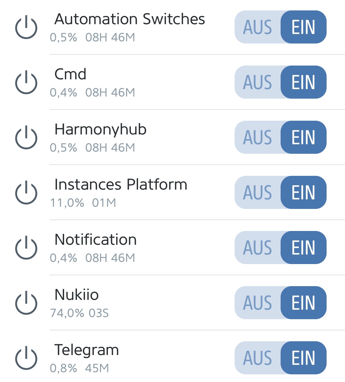 Apr 24 19:34:43 HomePi homebridge[24379]: [4/24/2019, 7:34:43 PM] [InstancesPlatform] [INFO] Homebridge Instances: Done (homebridge-fritz-platform)
