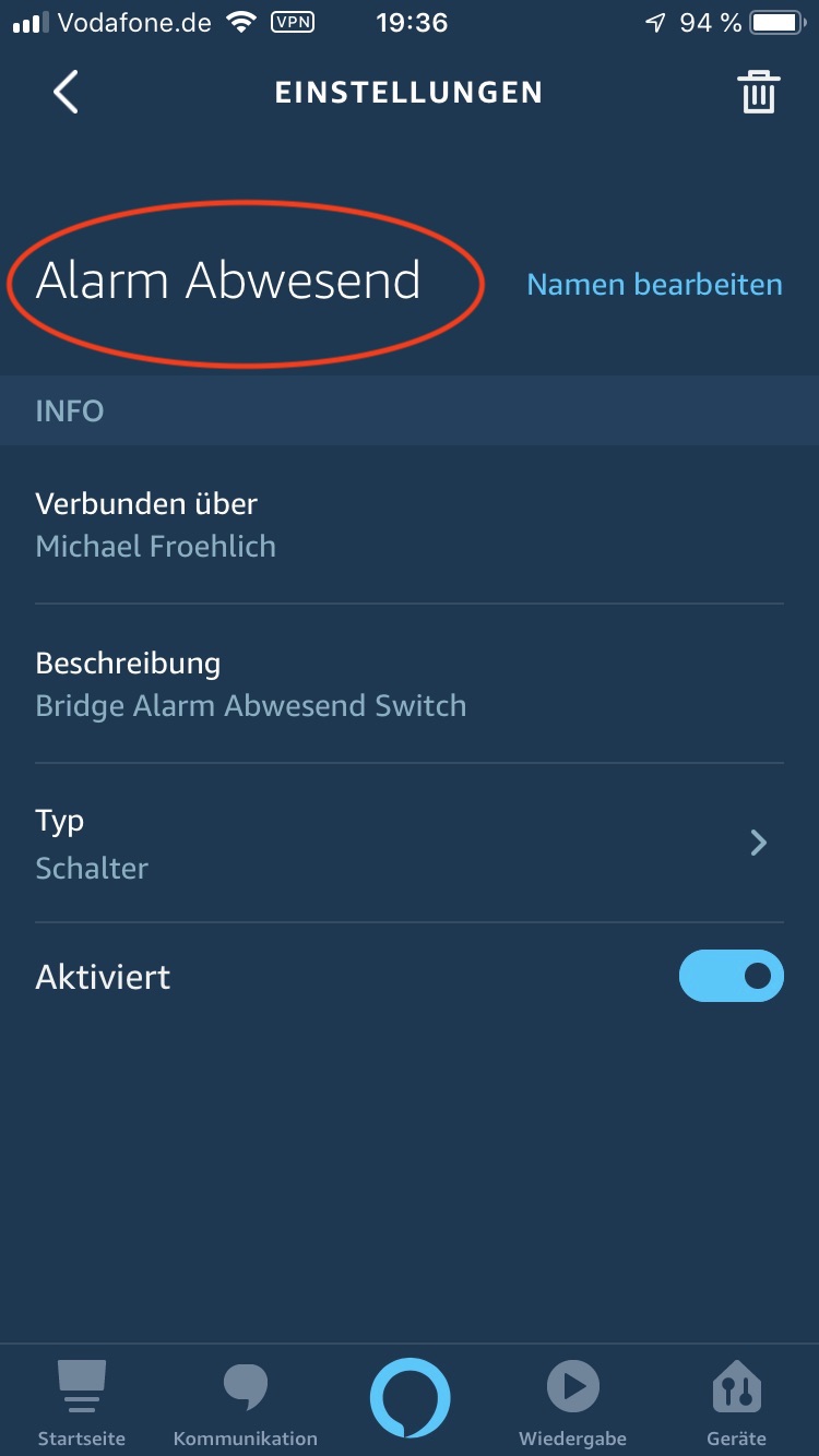Die Anlage kann dann auch über die Alexa-App aktiviert/deaktiviert werden!? Mach bitte mal ein Bild davon.