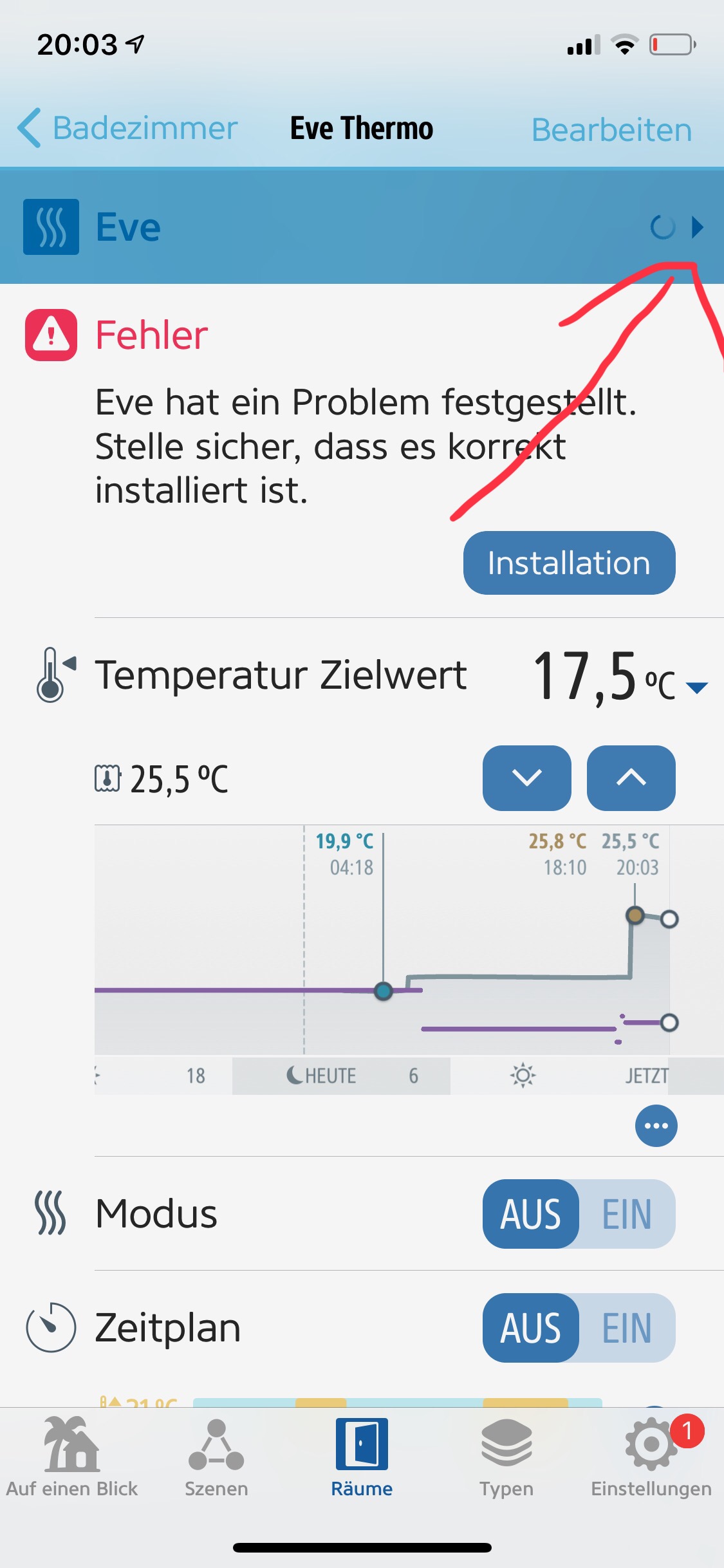 Allerdings steht ja schon in der Übersicht aus deinem Screenshot, dass etwas mit der Installation (gemeint ist die die physische Installation des Thermostat an die Heizung) nicht stimmt. Also abschrauben und wieder dran.