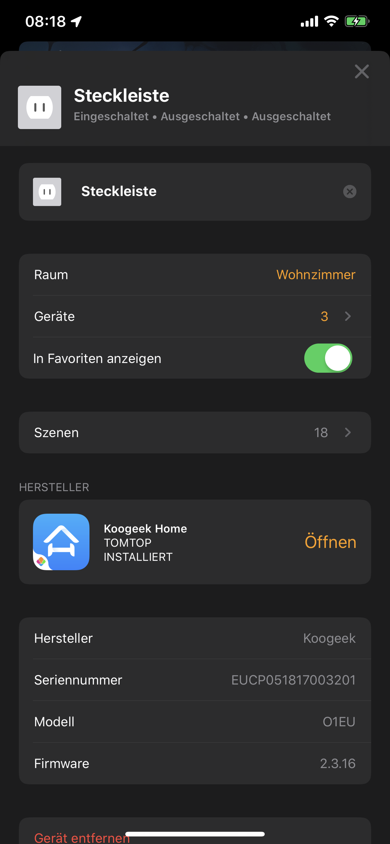 • In der Home-App werden scheinbar Geräte nur noch als ein Switch angezeigt und nicht mehr die einzelnen Switches als einzelne Elemente. Die einzelnen Elemente findet man dann nach einem Tap auf das Gerät. Das Naming ist dabei allerdings eher unglücklich. Z.B. heißt meine Koogeek Steckleiste mit 3 Switches nun "Fernseher", also wie der erste Switch, die weiteren Switches ("Fernsehlampe" & "Ventilator") sind nun nicht mehr so autonom wie vorher, nicht mal die Namen sind erkennbar, nur ihr Symbol und Status. Eine eher unschöne Änderung, wie ich finde... Ein Eve Room z.B. hat auch nur noch ein Element in Home statt zuvor 3 für je einen Wert, das ist widerrum ganz in Ordnung wie ich finde.