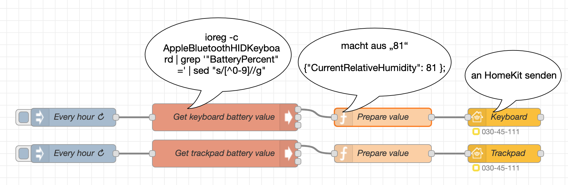 [{"id":"883badb.f65bc5","type":"exec","z":"369d80e.2abcb","command":"ssh [email protected] /usr/sbin/ioreg -c AppleBluetoothHIDKeyboard | grep '\"BatteryPercent\" =' | sed \"s/[^0-9]//g\"","addpay":false,"append":"","useSpawn":"false","timer":"","oldrc":false,"name":"Get keyboard battery value","x":780,"y":1640,"wires":[["bc29640b.85a9c8"],[],[]]},{"id":"b9c4c636.4773b8","type":"inject","z":"369d80e.2abcb","name":"Every hour","topic":"","payload":"","payloadType":"date","repeat":"3600","crontab":"","once":false,"onceDelay":0.1,"x":530,"y":1640,"wires":[["883badb.f65bc5"]]},{"id":"4d1763.1418e89c","type":"homekit-service","z":"369d80e.2abcb","bridge":"7524e8b8.7da908","name":"Keyboard","serviceName":"HumiditySensor","manufacturer":"Stefan Schustereit","model":"Node-Red","serialNo":"1","characteristicProperties":"{}","x":1240,"y":1640,"wires":[[]]},{"id":"bc29640b.85a9c8","type":"function","z":"369d80e.2abcb","name":"Prepare value","func":"msg.payload = { \"CurrentRelativeHumidity\": msg.payload.trim() };\nreturn msg;","outputs":1,"noerr":0,"x":1040,"y":1640,"wires":[["4d1763.1418e89c"]]},{"id":"62188cbb.f4c9d4","type":"exec","z":"369d80e.2abcb","command":"ssh [email protected] /usr/sbin/ioreg -c BNBTrackpadDevice | grep '\"BatteryPercent\" =' | sed \"s/[^0-9]//g\"","addpay":false,"append":"","useSpawn":"false","timer":"","oldrc":false,"name":"Get trackpad battery value","x":780,"y":1700,"wires":[["acb4e69d.be23f8"],[],[]]},{"id":"980f76f3.820a58","type":"inject","z":"369d80e.2abcb","name":"Every hour","topic":"","payload":"","payloadType":"date","repeat":"3600","crontab":"","once":false,"onceDelay":0.1,"x":530,"y":1700,"wires":[["62188cbb.f4c9d4"]]},{"id":"7a0e8d00.b80634","type":"homekit-service","z":"369d80e.2abcb","bridge":"7524e8b8.7da908","name":"Trackpad","serviceName":"HumiditySensor","manufacturer":"Stefan Schustereit","model":"Node-Red","serialNo":"1","characteristicProperties":"{}","x":1240,"y":1700,"wires":[[]]},{"id":"acb4e69d.be23f8","type":"function","z":"369d80e.2abcb","name":"Prepare value","func":"msg.payload = { \"CurrentRelativeHumidity\": msg.payload.trim() };\nreturn msg;","outputs":1,"noerr":0,"x":1040,"y":1700,"wires":[["7a0e8d00.b80634"]]},{"id":"7524e8b8.7da908","type":"homekit-bridge","z":"","bridgeName":"Node-RED","pinCode":"030-45-111","port":"","manufacturer":"Stefan Schustereit","model":"Node-RED","serialNo":"1.0"}]