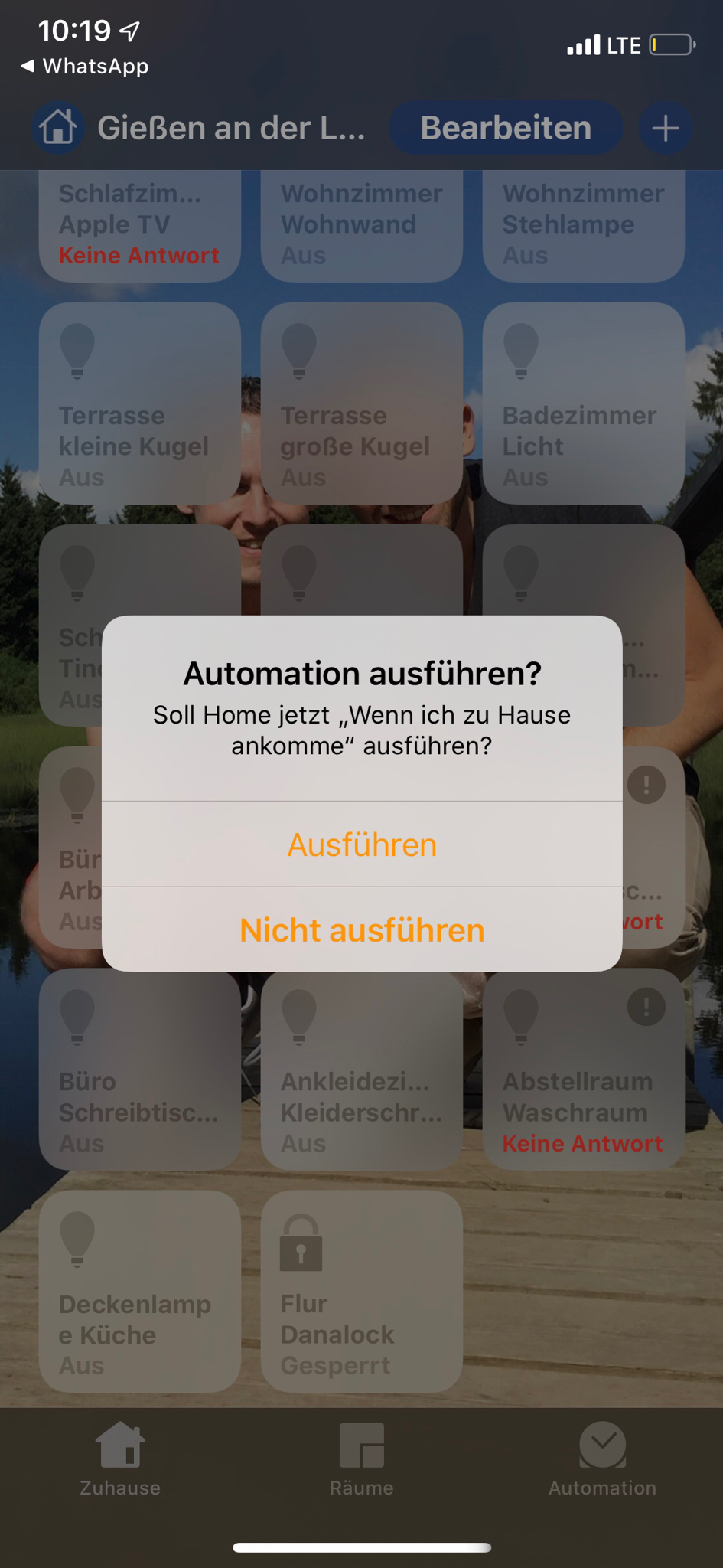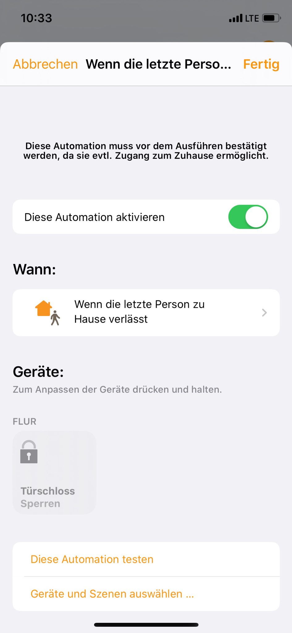 bin seit geraumer Zeit stolzer Besitzer des Danalock V3. Nunmehr wollte ich eine Automation starten wenn alle Personen das Haus verlassen das Danalock automatisch verriegelt. Egal was ich mache und tue es kommt zu keinem positiven Ergebnis. Alle Personen teilen ihren Standort. Ich bin quasi am verzweifeln woran es liegen kann. Bin derzeit Beta Tester und die zweite Person arbeitet mit iOS 13. Kann es eventuell daran liegen? Ansonsten stört mir halt die Aufforderung (siehe Bild) die Automation zu bestätigen. Hab jetzt schon beide iPhones und das iPad (als Steuerzentrale) auf den Kopf gestellt aber nichts passendes gefunden. Sicher muss diese Bestätigung sein da es sich nicht um eine Lampe oder einen HomePod handelt sondern um einen sensiblen Bereich. Kann mir von euch jemand weiterhelfen was ich eventuell falsch mache?