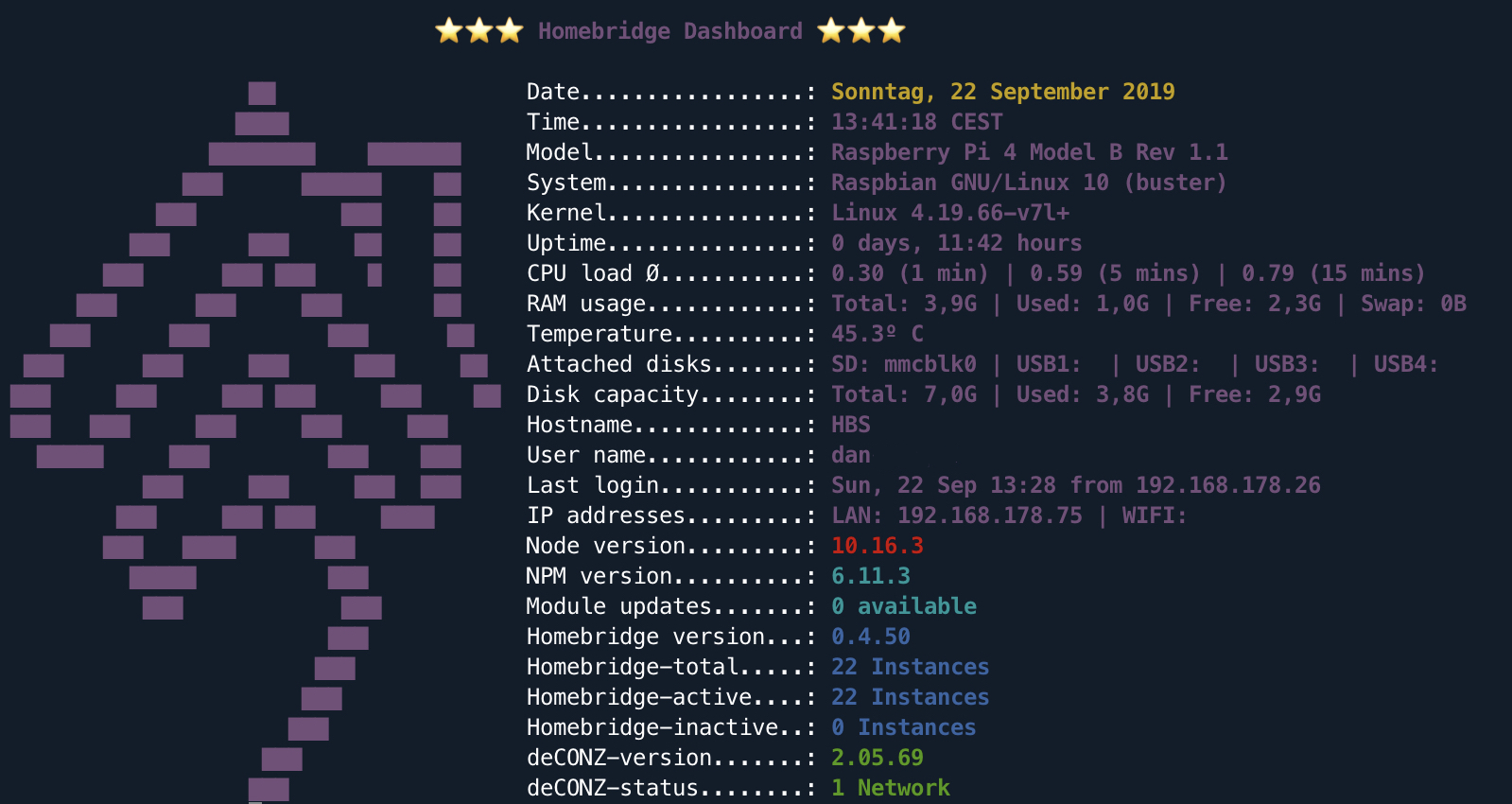 Alles anzeigenScript completely translated into English. Changed the order of the displayed lines. Display Colors assigned by topic, no longer by traffic light. Homebridge total added. Now you can see how many instances you have completely, how many are active and how many have stopped or failed. Homebridge area extended in script. So far, inactive instances are only displayed if they have been in restart mode or activating mode. Now also the instances that were stopped manually are displayed. Optional display of deCONZ networks built in. See also in readme: Display of additional modules.So sieht es jetzt aus: