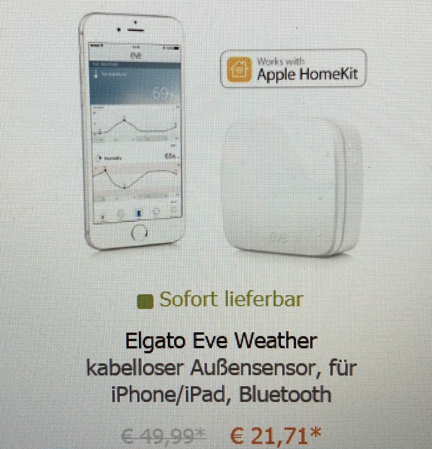 59,99€55€ bei https://smile.amazon.de/Elgato-Thermo-Heizkörperthermostat-HomeKit-Technologie-Temperatursteuerung/dp/B075Q2349H/ref=sr_1_1?ie=UTF8&qid=1517912427&sr=8-1&keywords=elgato+eve&tag=hktips-forum-21. Den Preis gibt es zwar mindestens einmal pro Woche, aber vielleicht möchte ja jemand ausgerechnet heute zuschlagen.