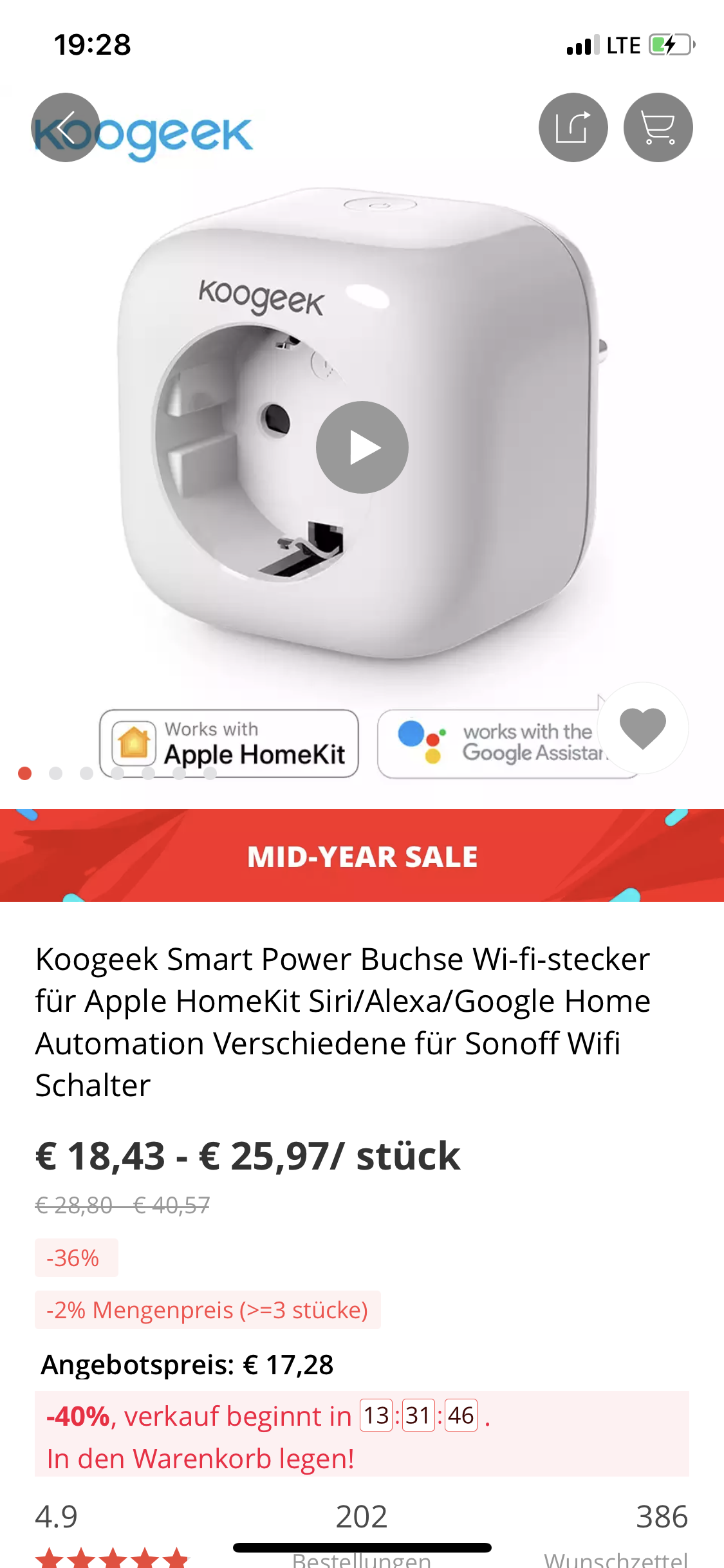 Zusätzlich ist auf Amazon der Koogeek Dimmer KH03CN für 38,75 € im Angebot zu finden auf der Produktseite unter Werbeangebote und dann 24 % Gutschein aktivieren. Alternativ ist dieser auch morgen ab 18.15 Uhr im Blitzangebot. Preis unbekannt aber vermutlich so um die 39,99.