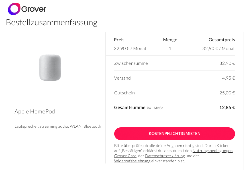 Bei Grover gibt es derzeit unter anderem den HomePod im Deal. Jetzt für einen Monat Test, nochmal günstiger.