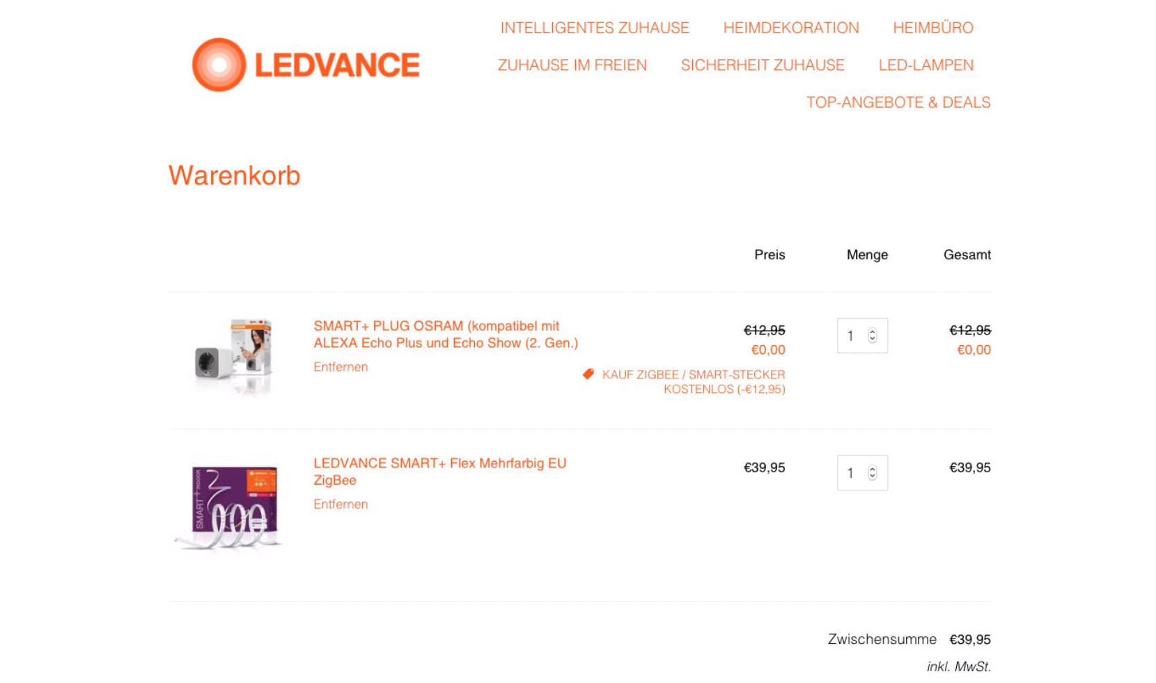 Beim Kauf eines ZigBee Produktes ueber den LEDVANCE shop, erhaltet ihr einen Gratis SMART+ PLUG OSRAM (kompatibel mit ALEXA Echo Plus und Echo Show (2. Gen.) dazu, wenn ihr diesen in den Warenkorb legt!