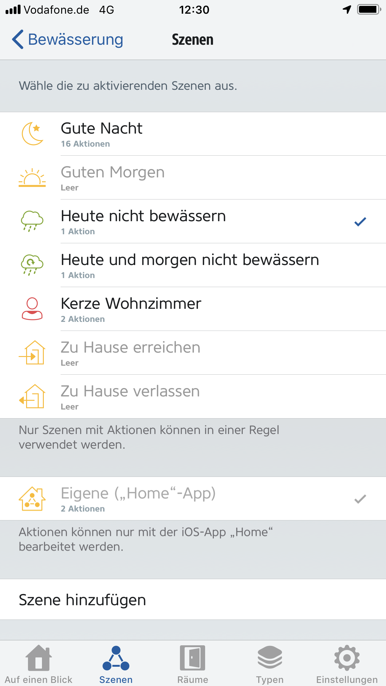 Meine naive Vorstellung war, eine Regel zu programmieren, das wenn die Feuchtigkeit über 30% liegt, einen Tag pausiert wird. Wenn die Feuchtigkeit über 50% liegt, zwei Tage pausisert wird. Aber ich scheitere schon an der ersten Regel. Inzwischen habe ich verstanden, das ich in Apple Homekit das so nicht hinbekomme, da AHK die Feuchtesensoren nicht als Bedingung zuläst.