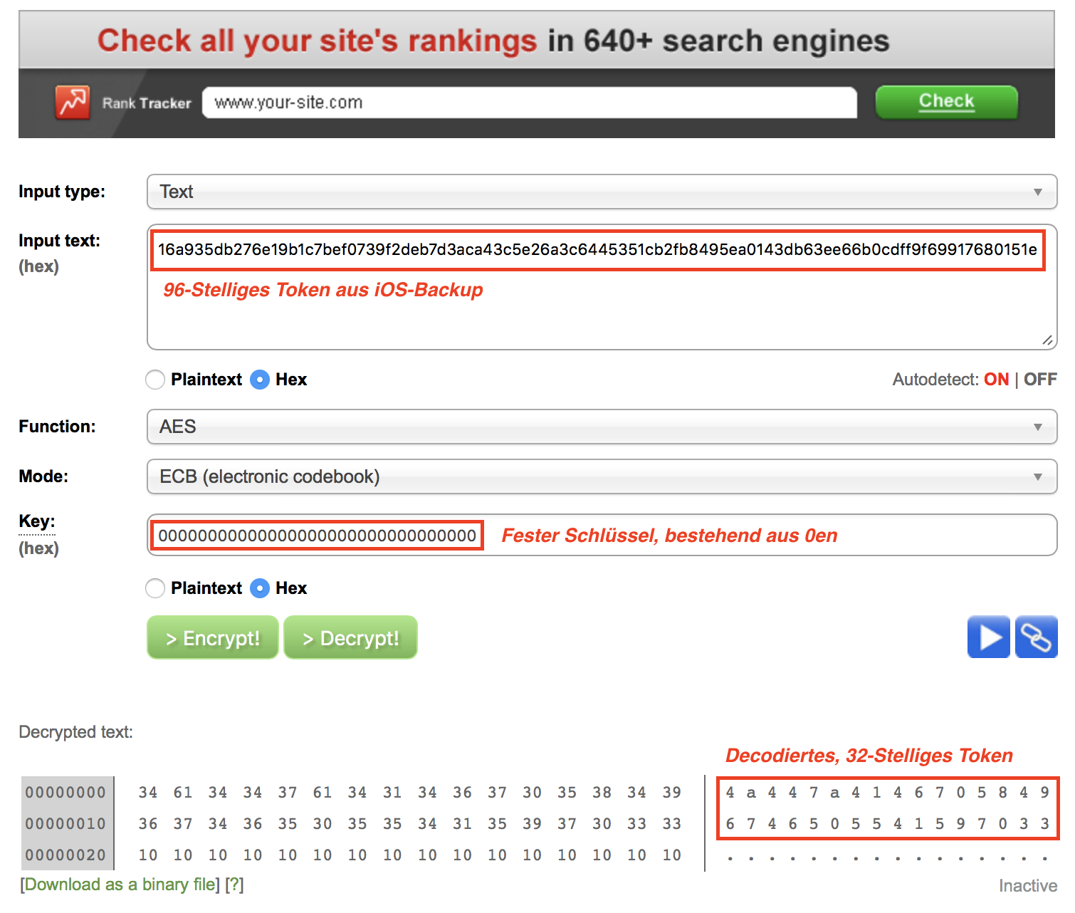 4.) Entschlüssen des Token (im Feld Key sind 32 Nullen einzutragen) <00000000000000000000000000000000>