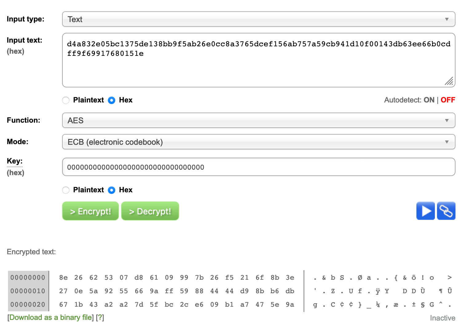 Also über die Website funktioniert das - gerade getestet - noch einwandfrei. Deine Codes haben 96-stellen und wenn ich es hex dekodiere, wird der passende 32-stellige decrypted text ausgegeben.