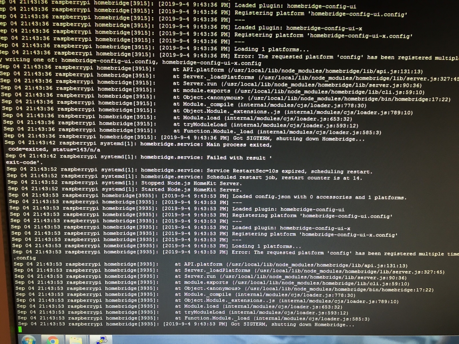 Ich bin am verzweifeln und zwar kriege ich immer wenn ich über die Config-Ui-X Bzw. „Systemctl restart homebridge“ immer folgenden Fehler: